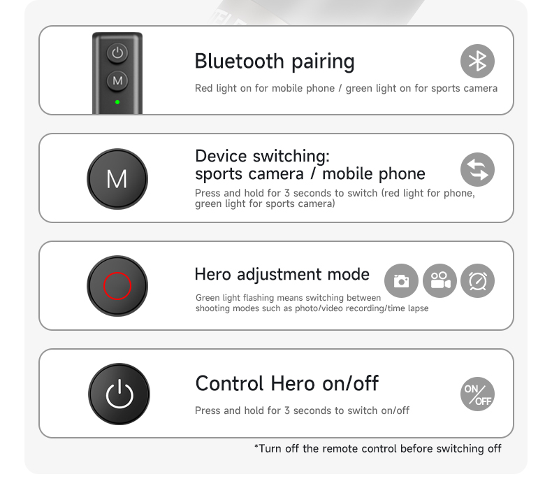 User Instructions: For a seamless experience with your GoPro camera or smartphone, follow our step-by-step guide to connect using the Bluetooth remote control.