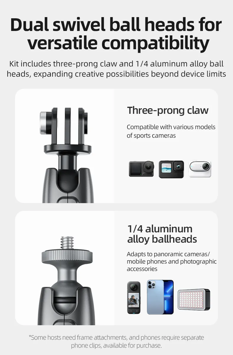 • Dual Swivel Ball Heads: Enhances versatility, providing wide compatibility with various devices thanks to its three-prong claw and 1/4 aluminum alloy ball heads.