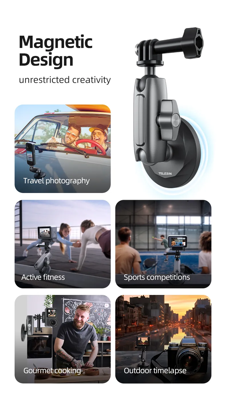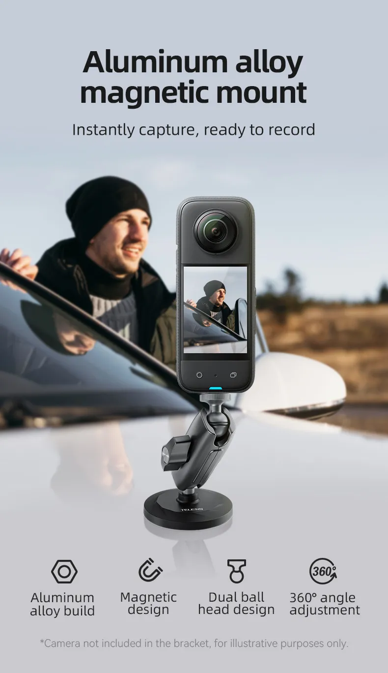 Explore the 360° Adjustable Aluminum Magnetic Camera Holder for action cameras & smartphones! Durable, secure, with a versatile dual swivel ball head design. Perfect for dynamic shooting!